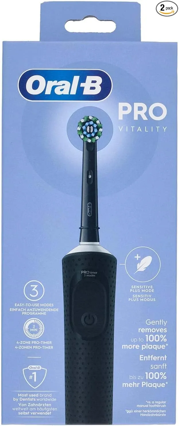 La Oral-B Vitality vise l’essentiel : une brosse électrique simple à utiliser, qui aide à être plus régulier qu’avec une manuelle (minuteur 2 min), avec la tête ronde Oral-B qui facilite le brossage dent par dent.